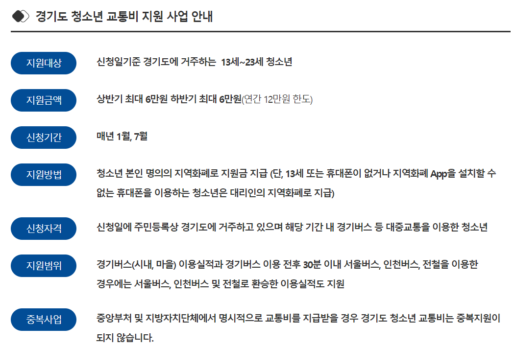 | 신청 방법 | 경기도 청소년 교통비 지원 포털(www.gbuspb.kr)에서 온라인 신청 |