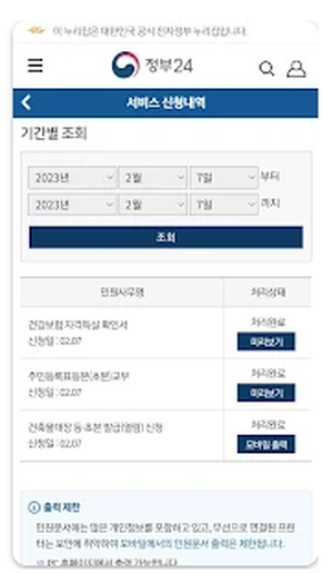 정부24 앱은 다양한 행정 서비스를 제공합니다. 가장 대표적인 기능은 민원 신청 및 발급 서비스입니다. 주민등록등본, 가족관계증명서 등 5,000여 종의 민원 서류를 언제 어디서나 신청하고 발급받을 수 있습니다. 처리기관, 구비서류, 수수료, 처리기한 등의 정보도 쉽게 확인할 수 있어 편리합니다.